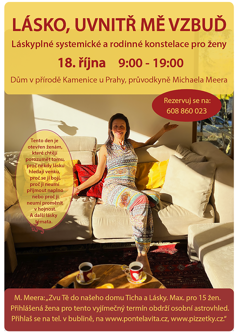 18. října 9:00-19:00 Kamenice u Prahy - max. pro 15 žen.18.10. nese energii hluboké proměny a každá přihlášená žena dostane osobní astrovhled, mapu, která ukáže, kde si právě ve svém životě stojí. Jako bonus bude po celý den skupinu harmonizovat frekvenční přístroj HEALY.